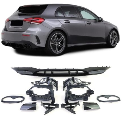 DIFFUSEUR ARRIERE NOIR BRILLANT LOOK A45 AMG POUR MERCEDES CLASSE A W177 A PARTIR DE 03/2018 AVEC PACK AMG NE CONVIENT PAS POUR MERCEDES CLASSE A W177 AVEC PARECHOC STANDARD FIXATIONS ET ACCESSOIRES DE MONTAGE FOURNIT CACHE REMORQUAGE FOURNIT PEINT COMPLETEMENT EN NOIR BRILLANT EMBOUTS DE POT NON...