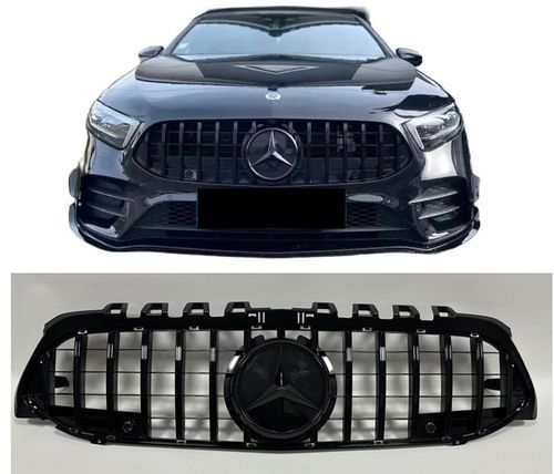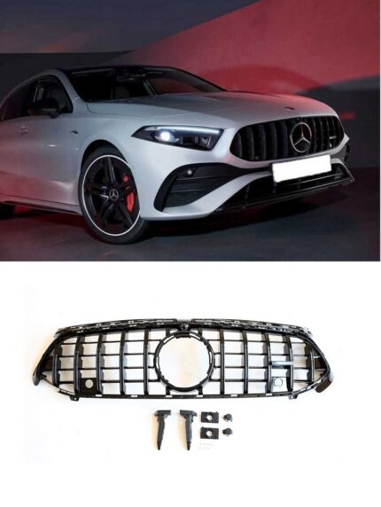 Calandre look AMG GT panamerica noir MERCEDES classe A W177 phase 1 de 03/2018 à 2022 Sans emplacement caméra Convient pour versions avec ou sans radar Couleur noir brillant et vernis Logo noir brillant fournit